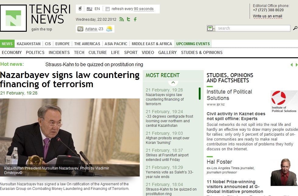 Kazakhstan on 22 February 2012 <Tengri News>: Nazarbayev signs law countering financing terrorism