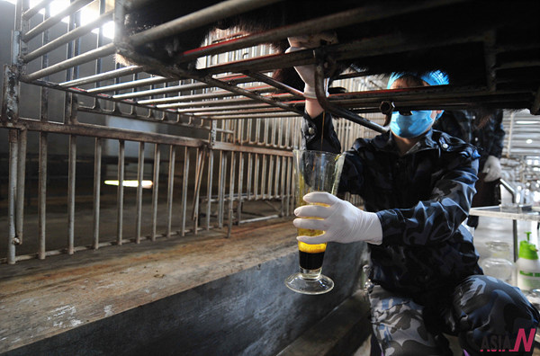 A practitioner disinfected the surgical cut in the bear’s abdomen, which was confined in a small cage. Then, he inserted an 8-centimeter-long fine tube into the cut, and about 100 milliliters of bile flowed out. Finally, he removed the tube and disinfected the cut again.