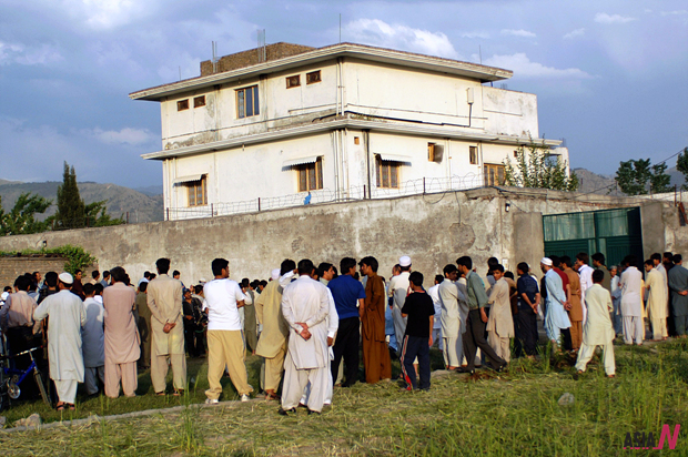 This file photo taken on May 4, 2011, shows media personnel and local residents gather outside the compound where Osama bin Laden had hidden inside for years in northwest Pakistan’s Abbottabad.