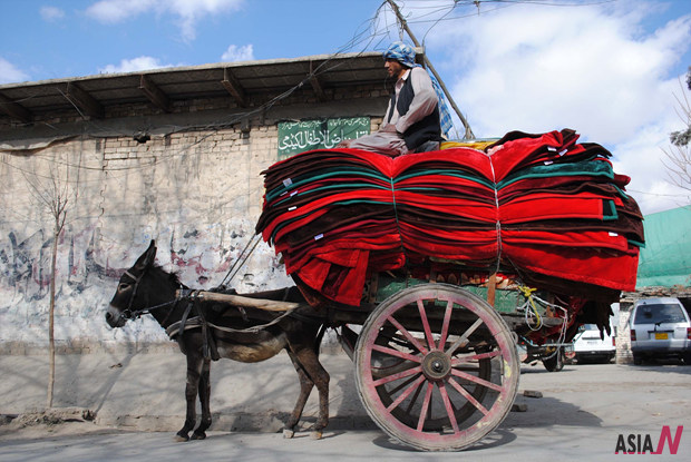 A Pakistani vendor sits on top of a pile of blankets as he drives his donkey-cart along a road in southwest Pakistan’s Quetta on Feb. 27, 2012. <Photo: Xinhua/Mohammad>