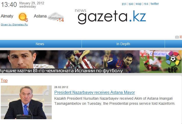 Kazakhstan on 29 February 2012 <Gazeta>: President Nazarbayev receives Astana Mayor
