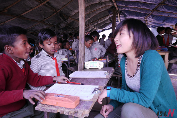 A Chinese volunteer talks to her students at a slum school in northern Indian state of Haryana, Feb. 17, 2012. <Photo DB: Xinhua>