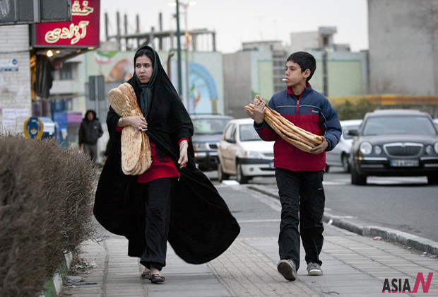 Pedestrians carrying local bread walk at Azadi (Freedom) Street in Tehran, capital of Iran, March 1, 2012. <Photo: Xinhua/Ahmad Halabisaz>
