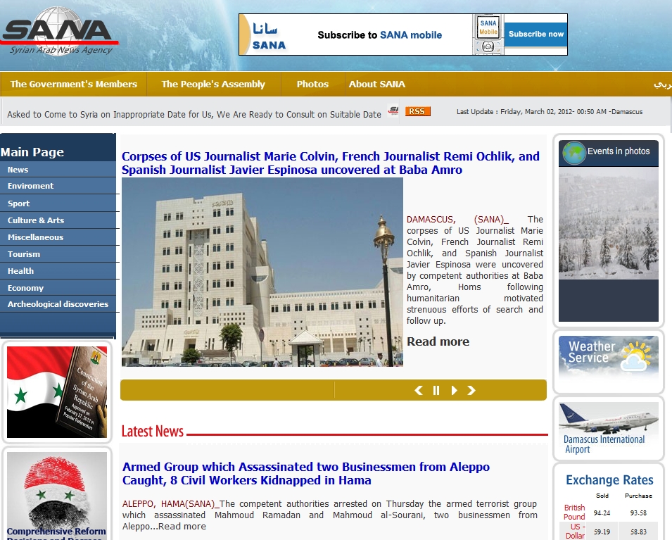 Syria on 2 March 2012 <SANA>: Corpses of US Journalist Marie Colvin, French Journalist Remi Ochlik, and Spanish Journalist Javier Espinosa uncovered at Baba Amro