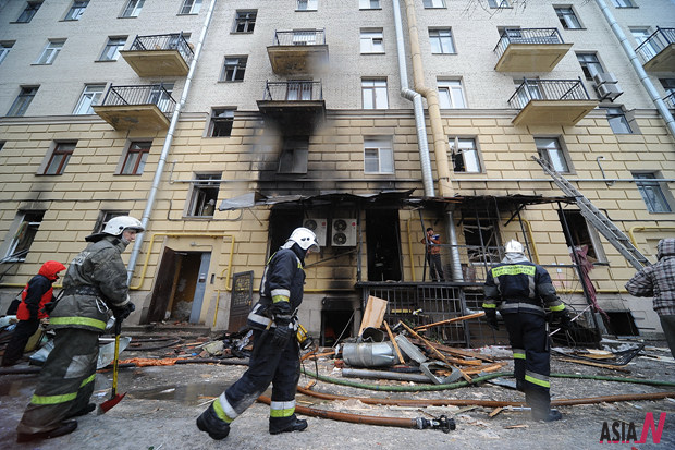 Firefighters work at the gas explosion hit Chinese restaurant in St. Petersburg, Russia, March 2, 2012. At least eight people were injured on Friday after the gas blast caused fire at the restaurant. <Photo: Xinhua/Valentina Svistukova>