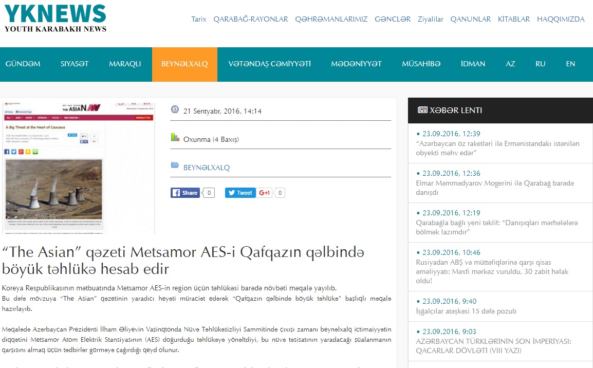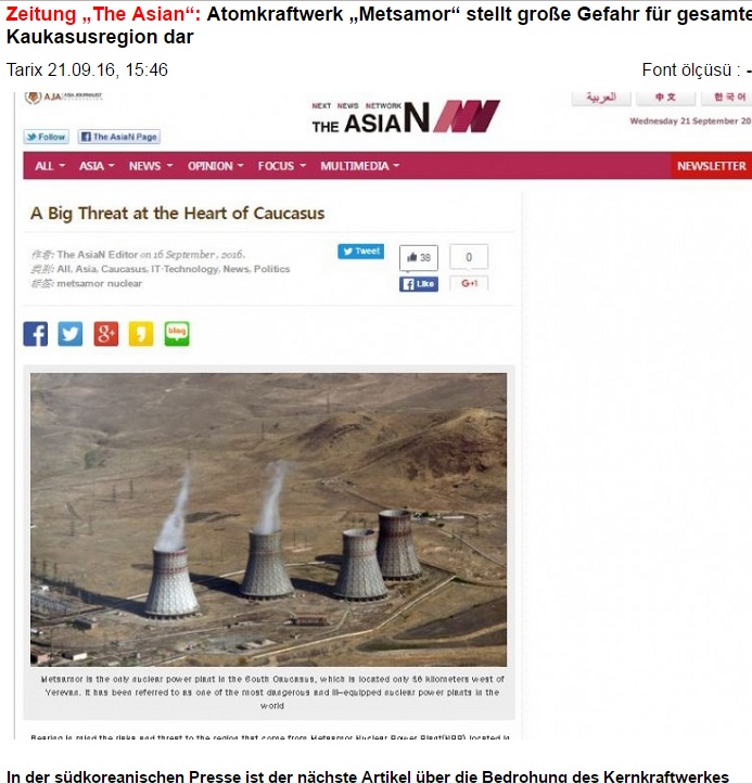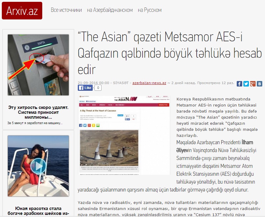 The AsiaN’s news about Metsamor Nuclear Power Plant has been published by major media agencies of Azerbaijan. The news was translated into several languages such as French, German, Russian and Armenian as well as Azerbaijani language.