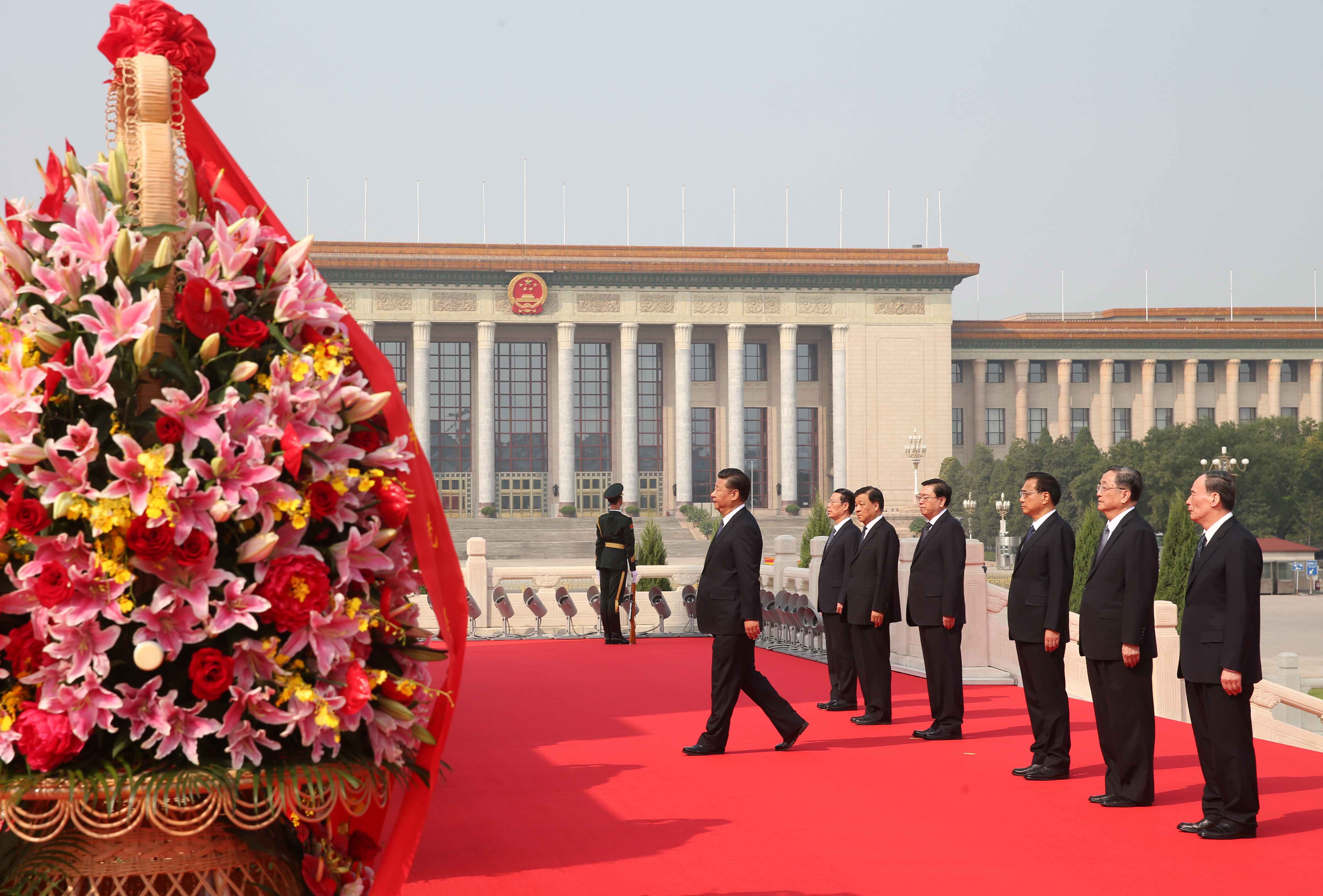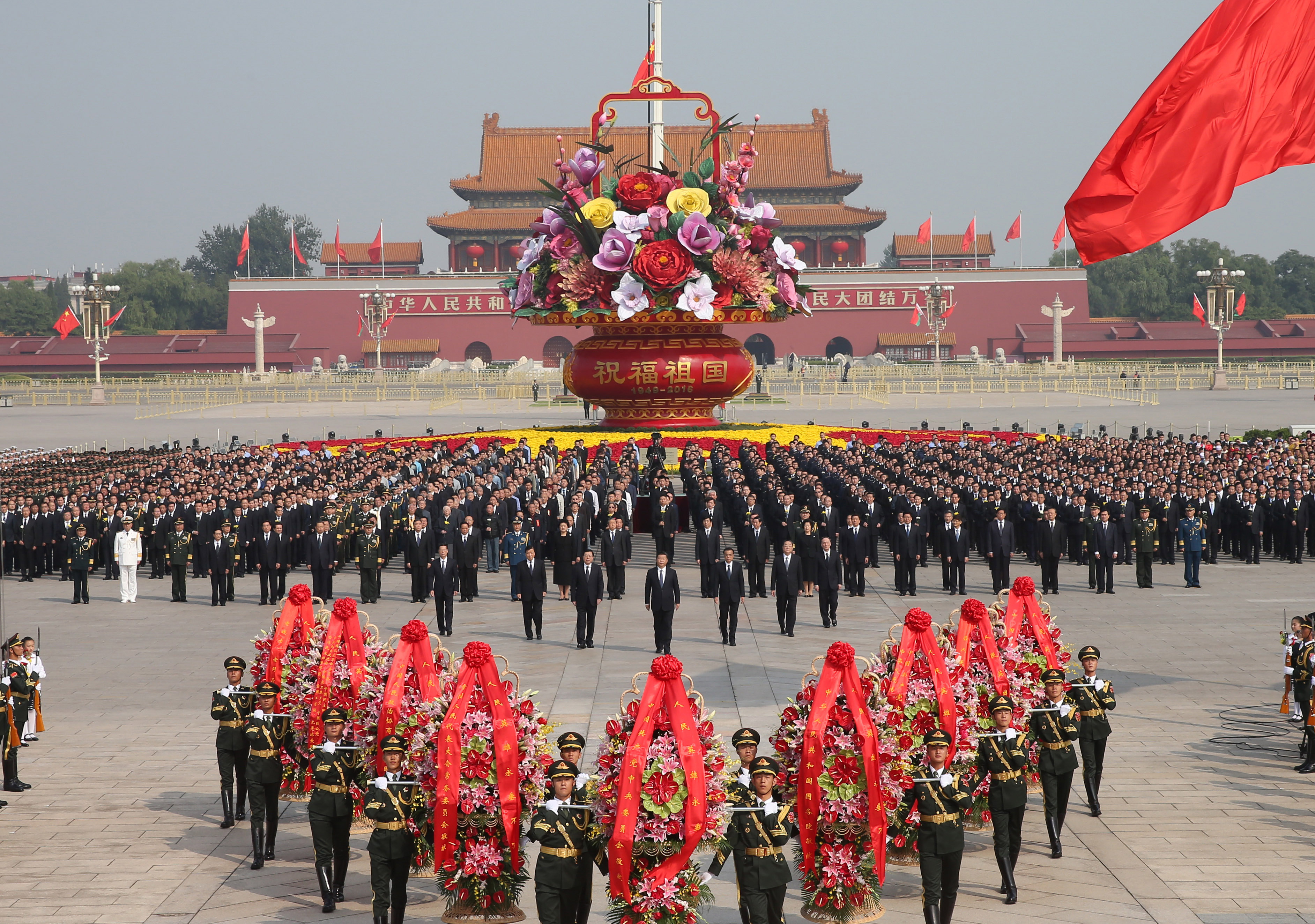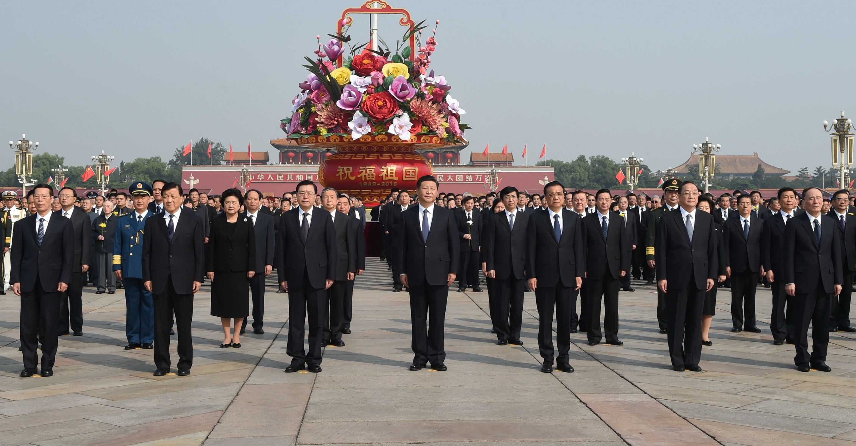 (160930) — BEIJING, Sept. 30, 2016 (Xinhua) — Chinese President Xi Jinping and other senior leaders Li Keqiang, Zhang Dejiang, Yu Zhengsheng, Liu Yunshan, Wang Qishan and Zhang Gaoli attend a ceremony at the Tian’anmen Square in Beijing, capital of China, Sept. 30, 2016, to honor and remember deceased national heroes on the Martyrs’ Day. (Xinhua/Yao Dawei) (ry)