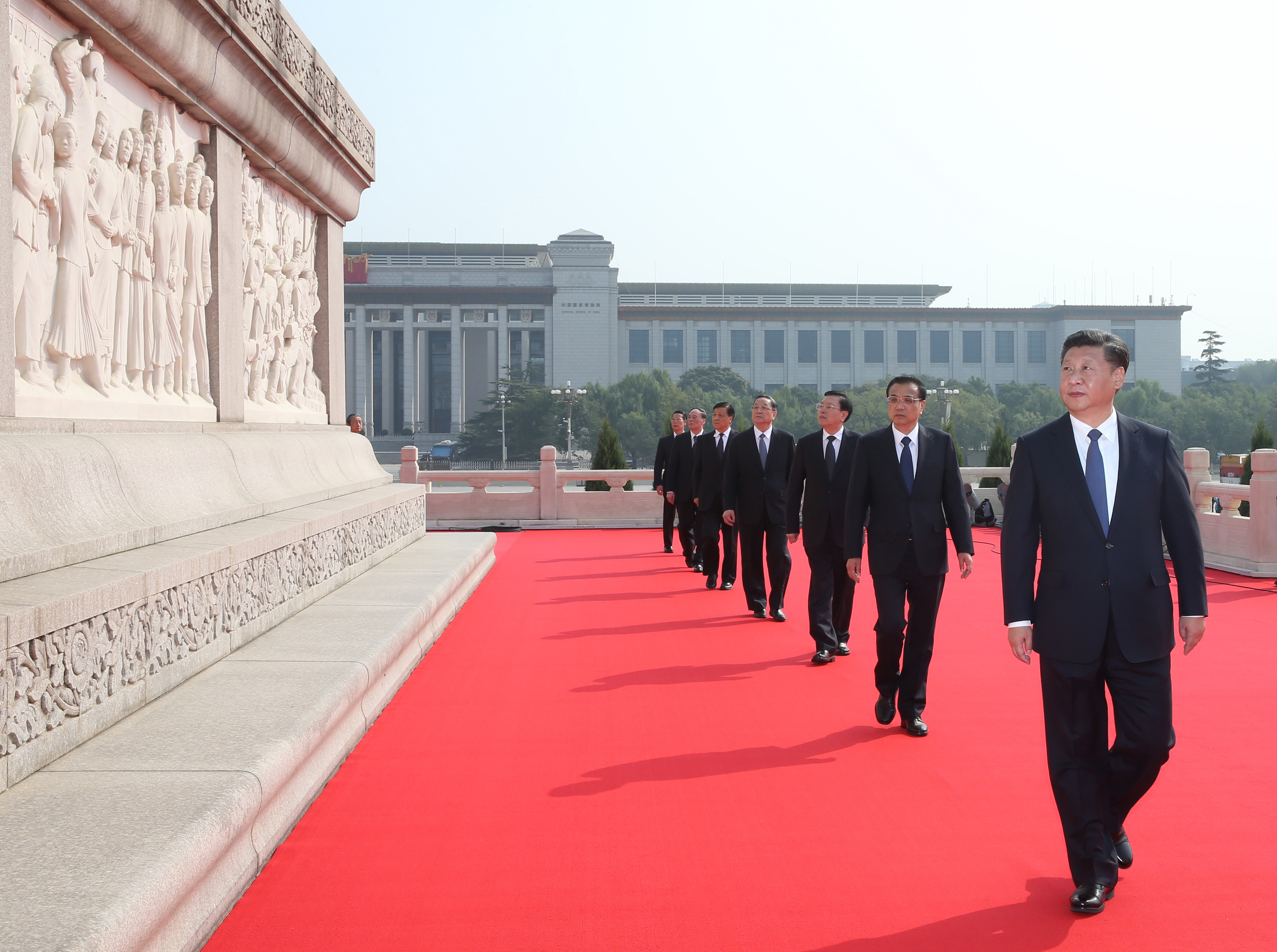 (160930) — BEIJING, Sept. 30, 2016 (Xinhua) — Chinese President Xi Jinping (front) and other senior leaders visit the Monument to the People’s Heroes at the Tian’anmen Square in Beijing, capital of China, Sept. 30, 2016. Chinese President Xi Jinping and other senior leaders Li Keqiang, Zhang Dejiang, Yu Zhengsheng, Liu Yunshan, Wang Qishan and Zhang Gaoli attended a ceremony Friday at the Tian’anmen Square to honor and remember deceased national heroes on the Martyrs’ Day. (Xinhua/Pang Xinglei) (ry)