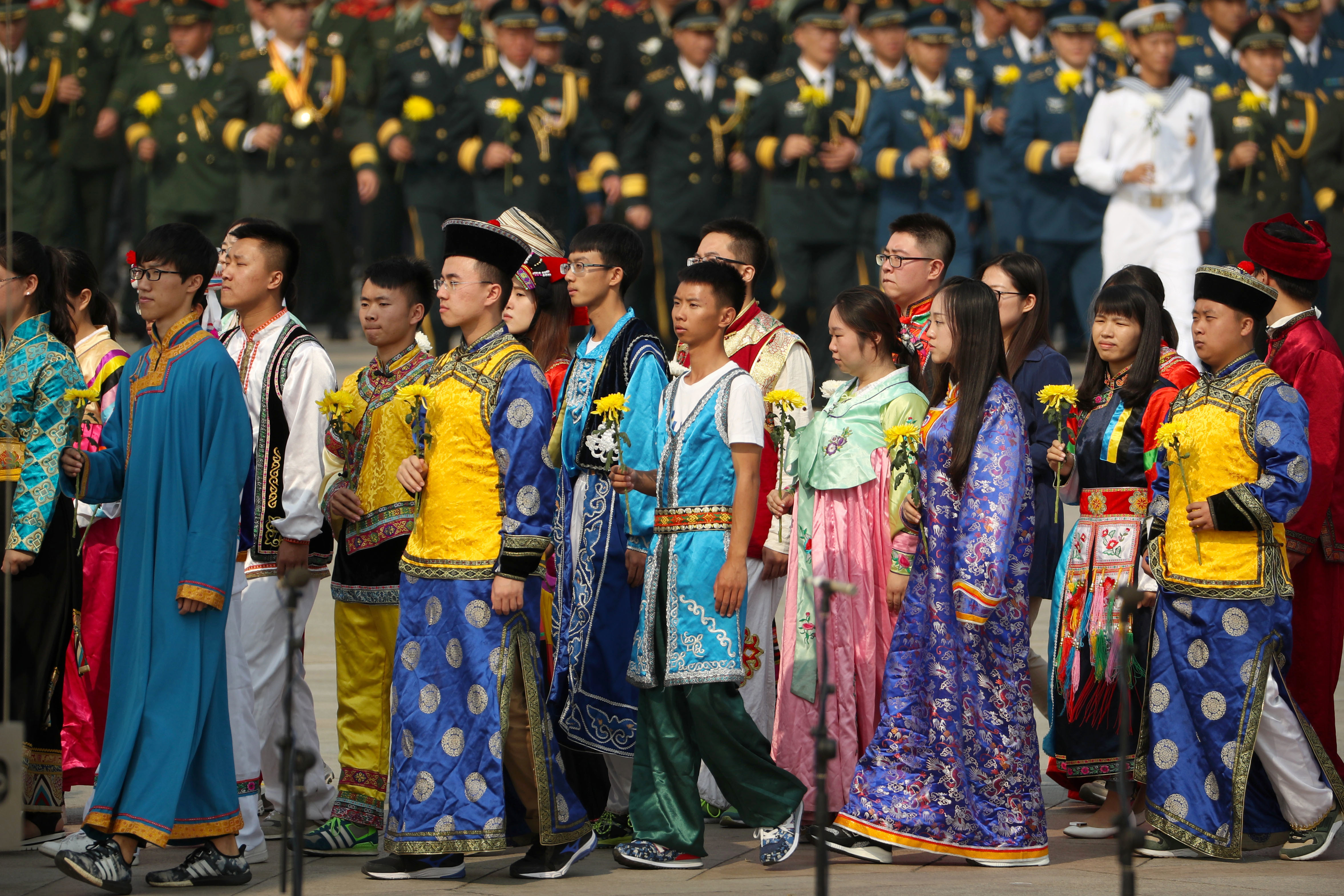 Chinese young people in ethnic minority dress walk to pay respects during a ceremony marking Martyrs’ Day at Tiananmen Square in Beijing Friday, Sept. 30, 2016. Chinese President Xi Jinping and other Chinese leaders presented flower baskets and scores of ordinary people filed up to lay a single flower each on Friday at the Monument to the People’s Heroes to mark Martyrs’ Day. (AP Photo/Mark Schiefelbein)