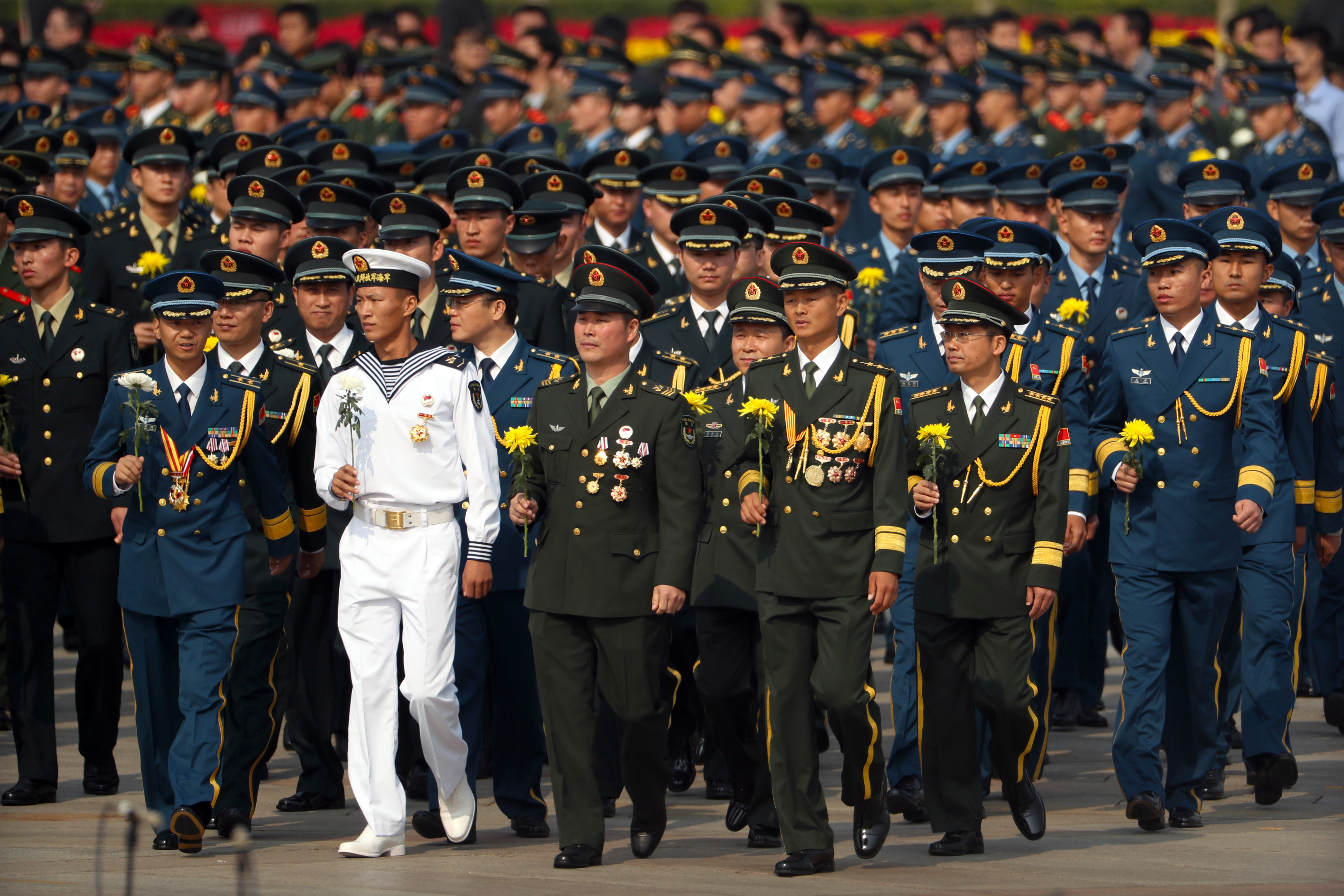 Members of China’s People’s Liberation Army (PLA) walk to pay respects during a ceremony marking Martyrs’ Day at Tiananmen Square in Beijing Friday, Sept. 30, 2016. Chinese President Xi Jinping and other Chinese leaders presented flower baskets and scores of ordinary people filed up to lay a single flower each on Friday at the Monument to the People’s Heroes to mark Martyrs’ Day. (AP Photo/Mark Schiefelbein)