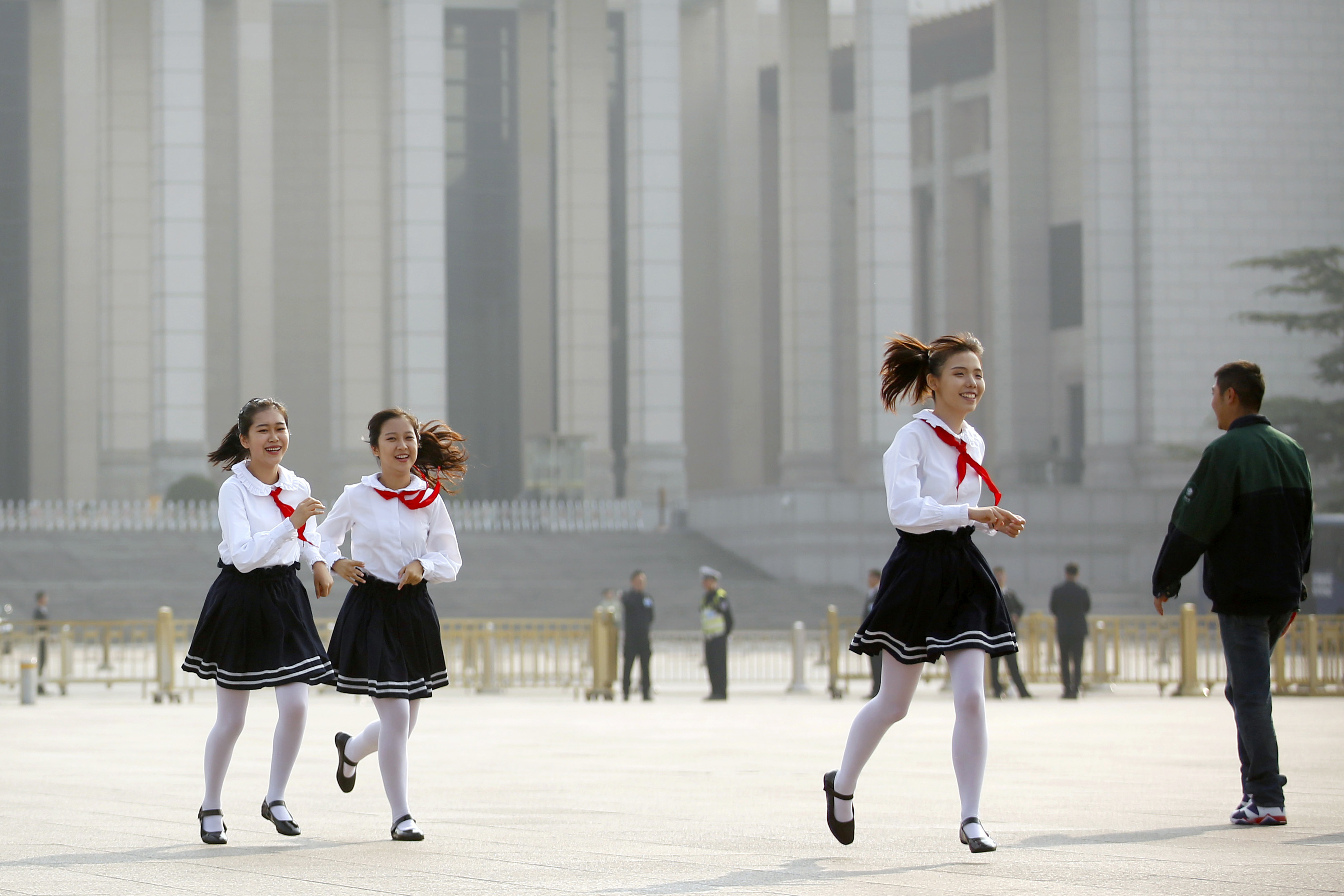 Late-arriving members of Chinese Communist Party’s Young Pioneers youth organization run across Tiananmen Square before a ceremony marking Martyrs’ Day in Beijing Friday, Sept. 30, 2016. Chinese President Xi Jinping and other Chinese leaders presented flower baskets and scores of ordinary people filed up to lay a single flower each on Friday at the Monument to the People’s Heroes to mark Martyrs’ Day. (AP Photo/Mark Schiefelbein)