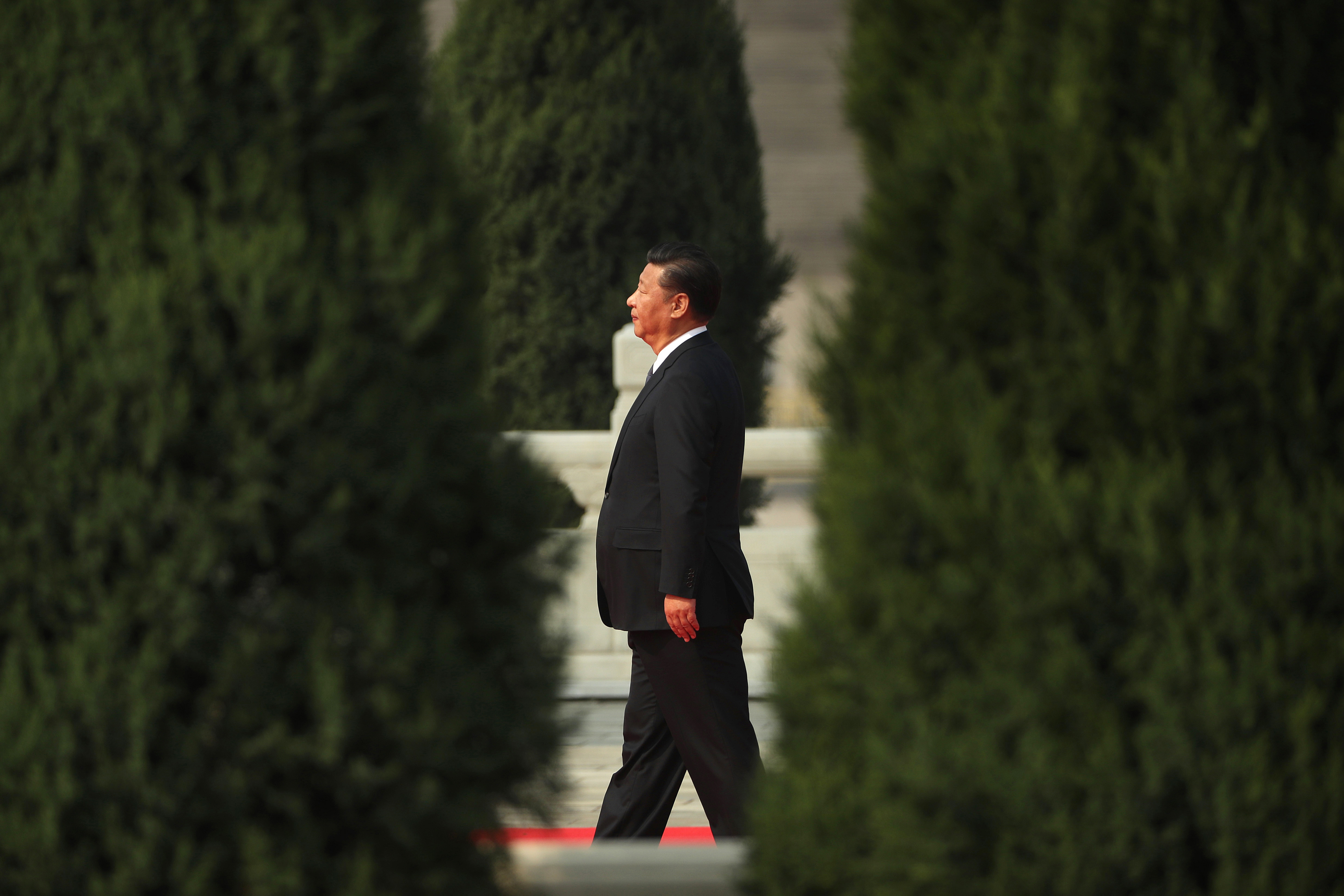 Chinese President Xi Jinping walks toward the Monument to the People’s Heroes during a ceremony marking Martyrs’ Day at Tiananmen Square in Beijing Friday, Sept. 30, 2016. Xi and other Chinese leaders presented flower baskets and scores of ordinary people filed up to lay a single flower each on Friday at the monument to mark Martyrs’ Day. (AP Photo/Mark Schiefelbein)