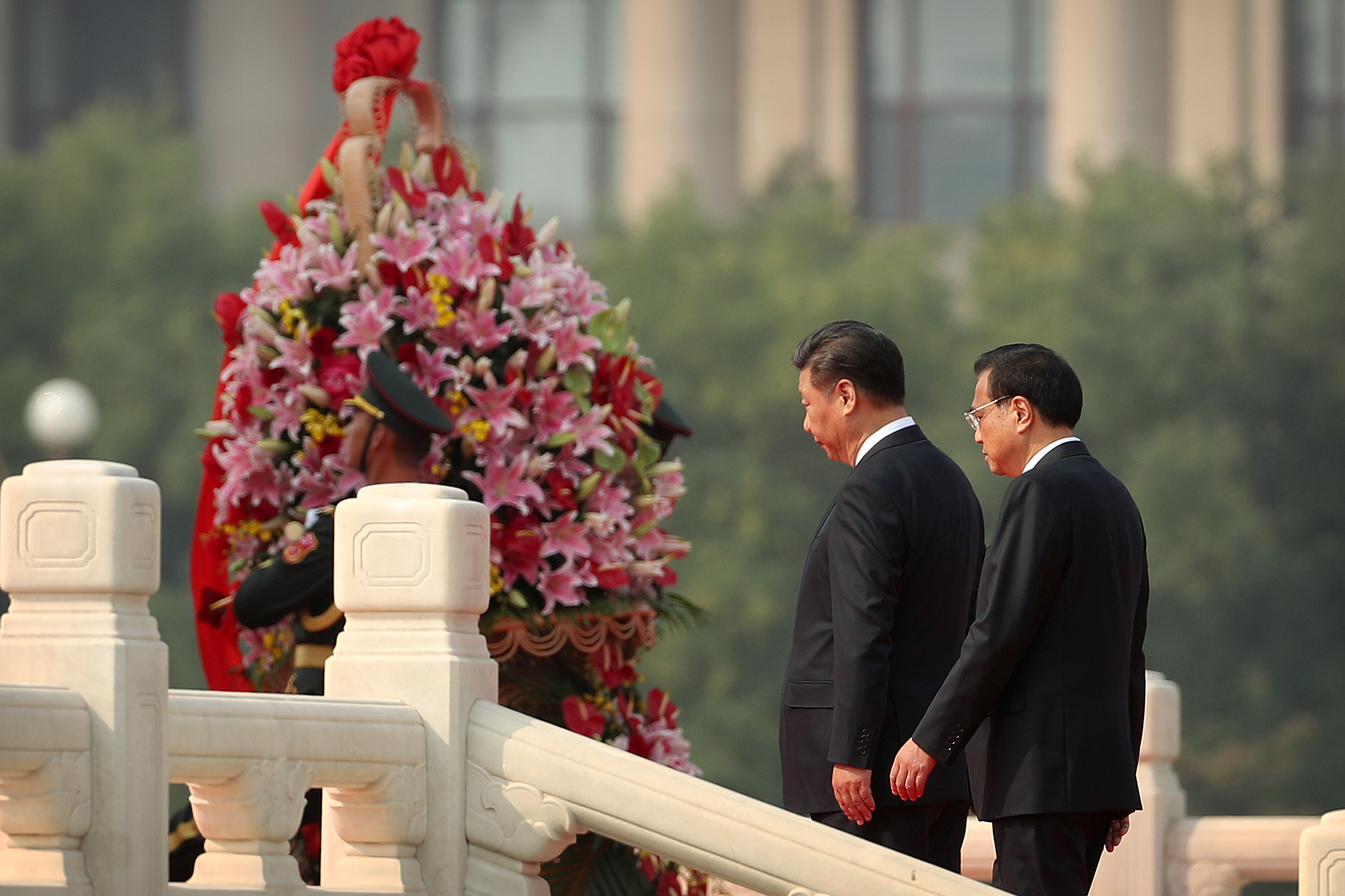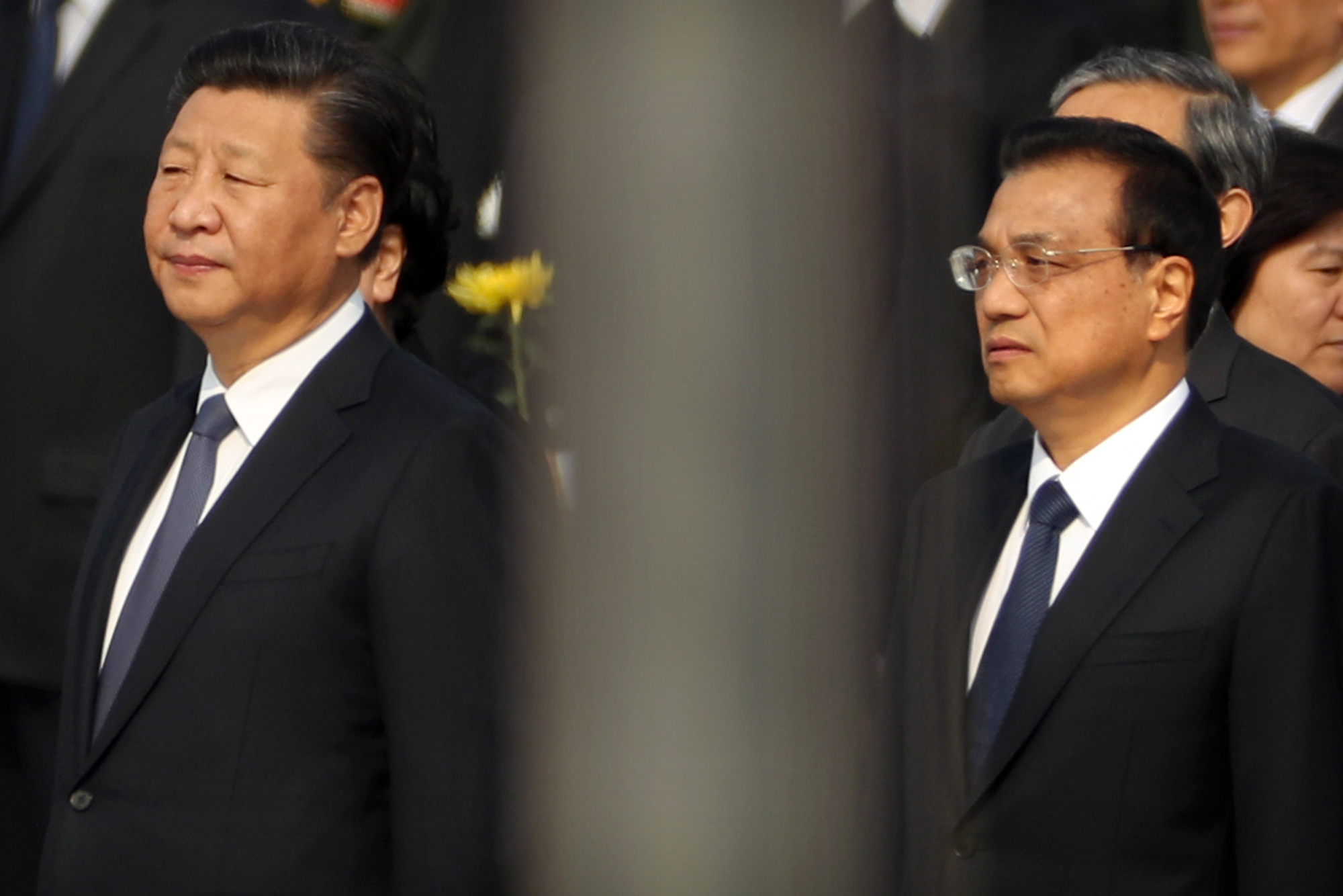 Chinese President Xi Jinping, left, and Premier Li Keqiang, right, stand during a ceremony marking Martyrs’ Day at Tiananmen Square in Beijing Friday, Sept. 30, 2016. Xi and other Chinese leaders presented flower baskets and scores of ordinary people filed up to lay a single flower each on Friday at the Monument to the People’s Heroes to mark Martyrs’ Day. (AP Photo/Mark Schiefelbein)