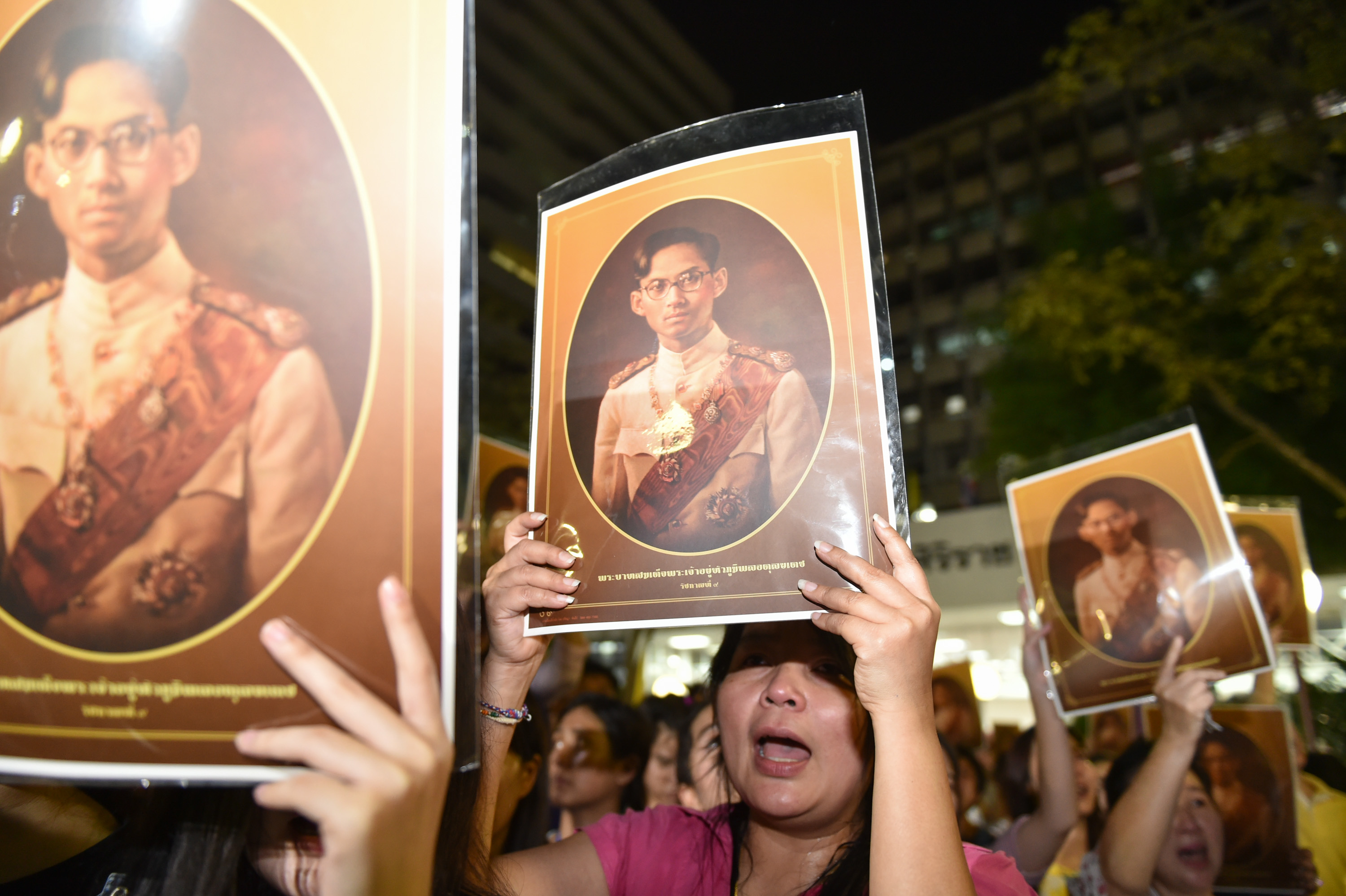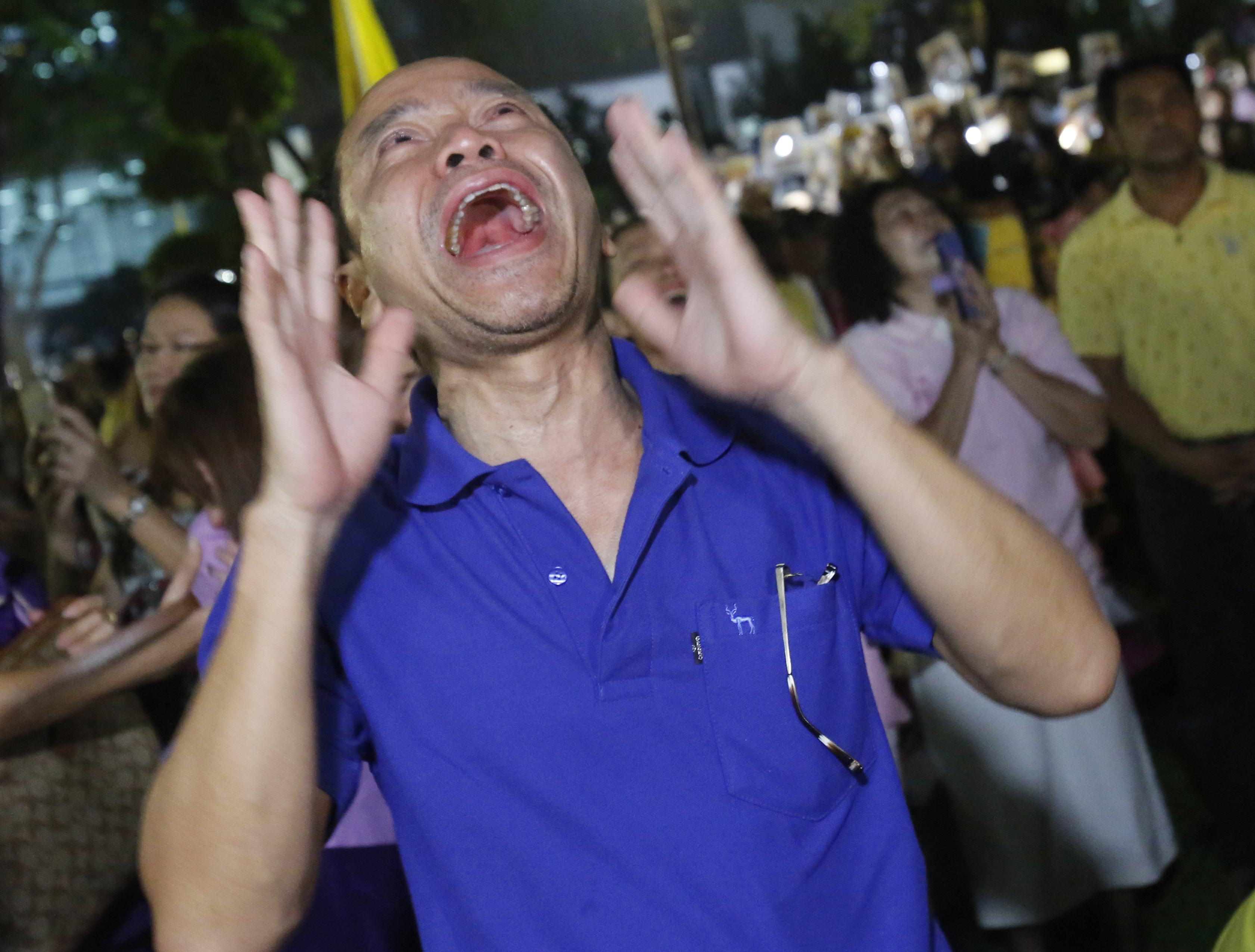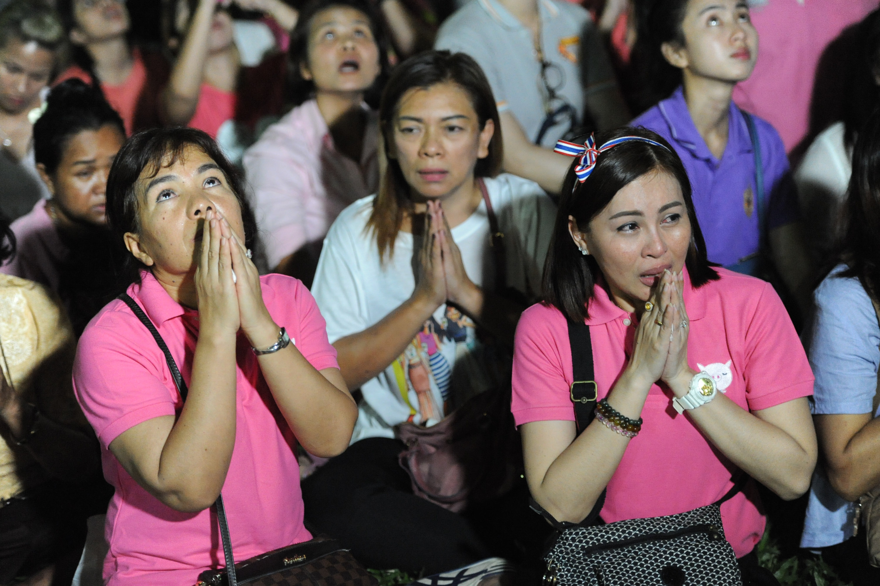 Thais cry as they pray for Thailand’s King Bhumibol Adulyadej at Siriraj Hospital where the king is being treated in Bangkok, Thailand, Thursday, Oct. 13, 2016. The royal palace said in a statement late Wednesday that the 88-year-old king’s blood pressure had dropped, his liver and kidneys were not working properly and he remained on a ventilator. (AP Photo/Sakchai Lalit)
