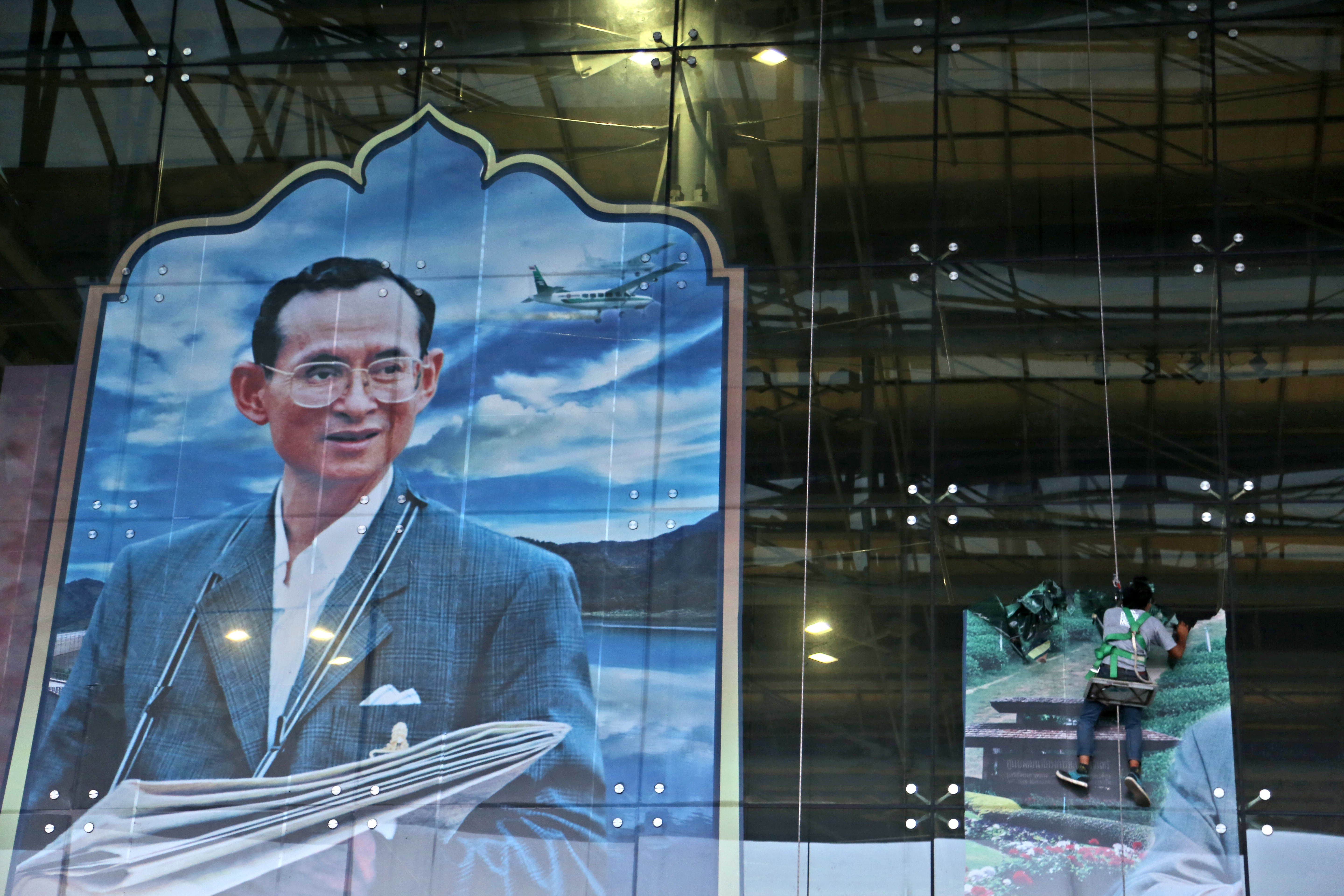Workers move a photograph of Thai King Bhumibol Adulyadej on a window at Bangkok’s International Airport Thursday, Oct. 13, 2016. Hundreds of tearful Thais were continuing to offer flowers and chant prayers on Thursday for King Bhumibol Adulyadej outside the Bangkok hospital where the world’s longest-reigning monarch is being treated for multiple health problems. (AP Photo/Mark Baker)