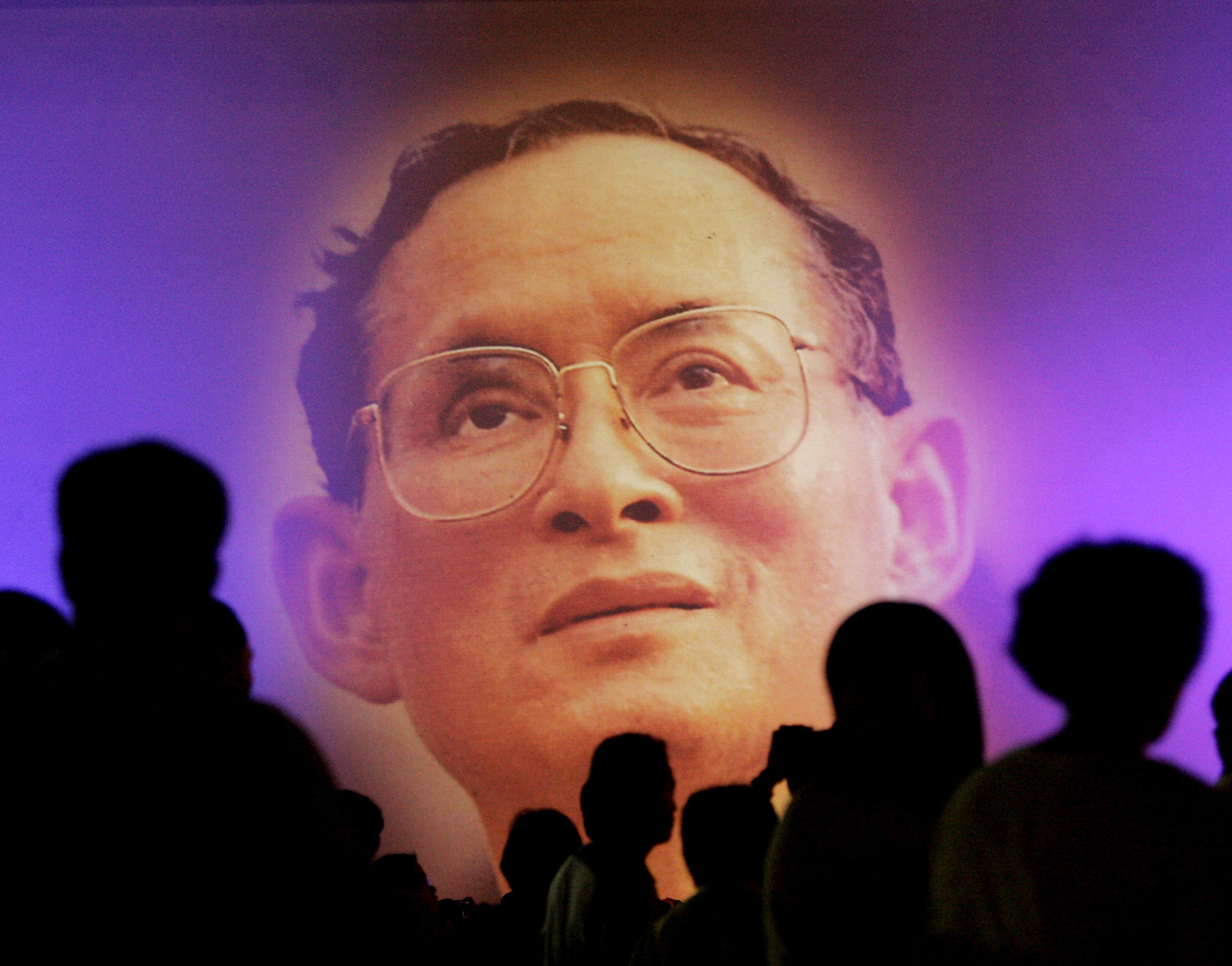 FILE – In this June 10, 2006, file photo, an image of Thailand’s King Bhumibol Adulyadej is projected during an exhibition in Bangkok. Thailand’s Royal Palace said on Thursday, Oct. 13, 2016, that King Bhumibol, the world’s longest-reigning monarch, has died at age 88. (AP Photo/Apichart Weerawong, File)