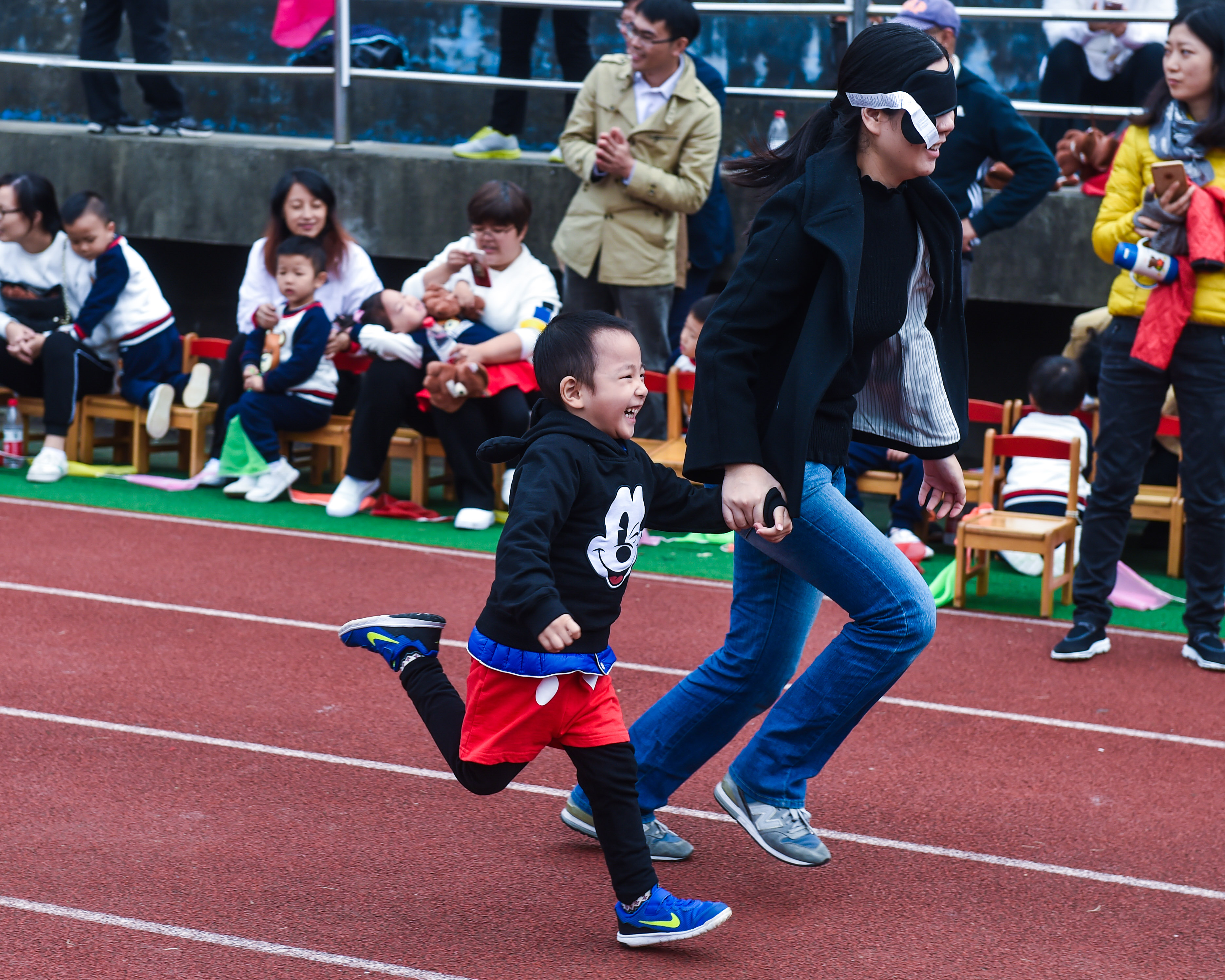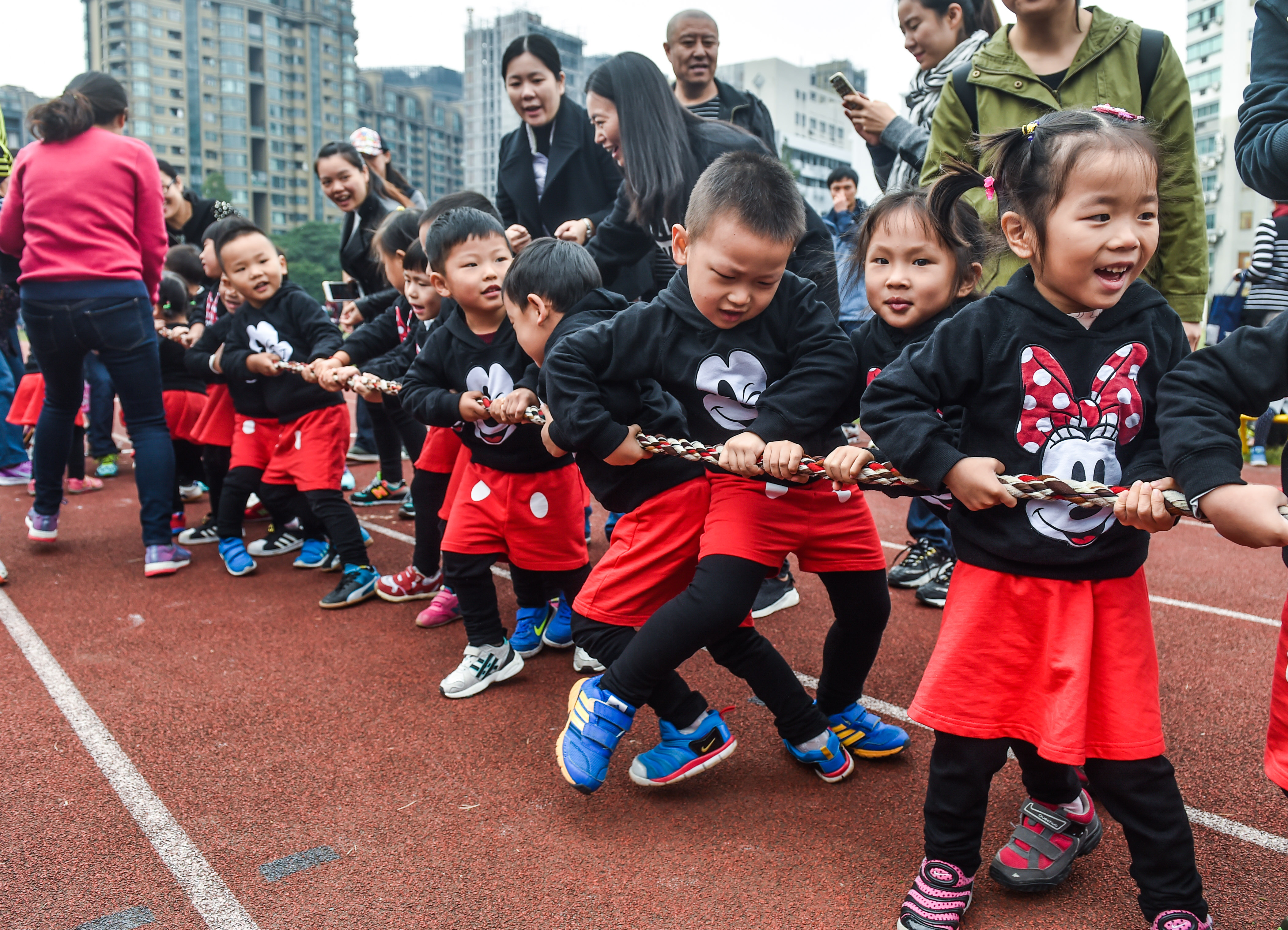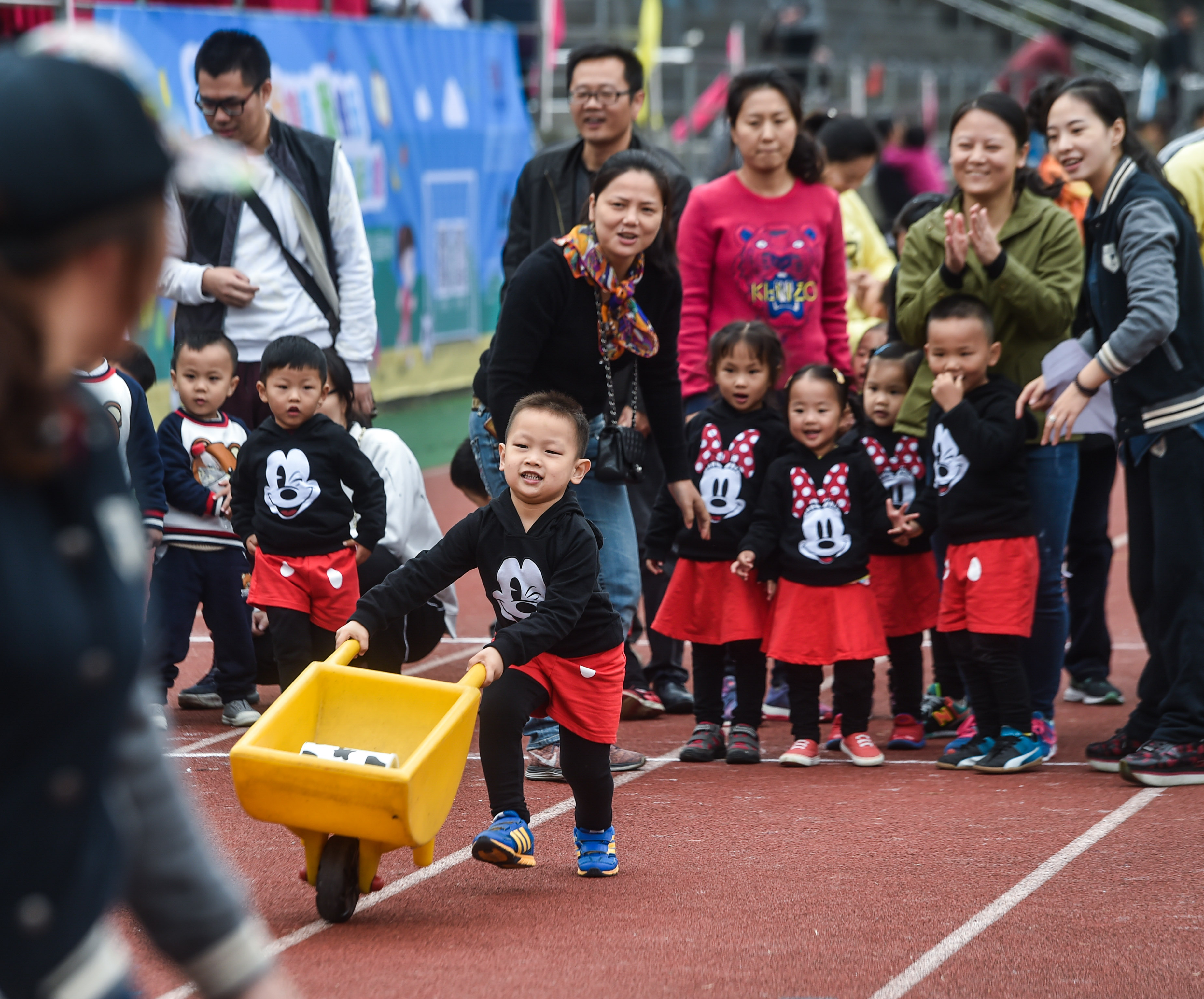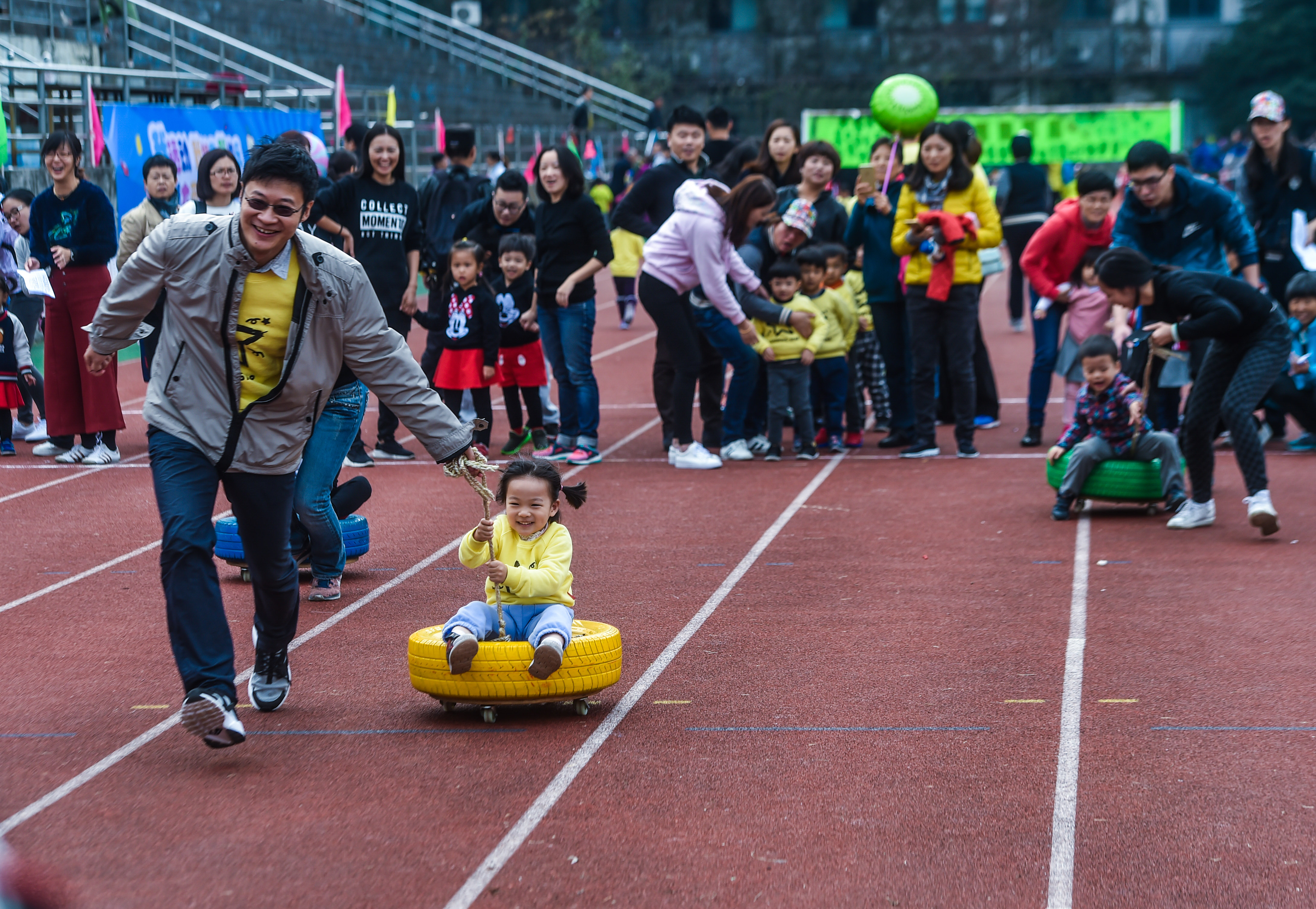 Children take part in a race during the Moms and Dads Sports Day at a kindergarten in Hangzhou, east China’s Zhejiang Province, Nov. 2, 2016.  (Xinhua/Xu Yu) (wx)