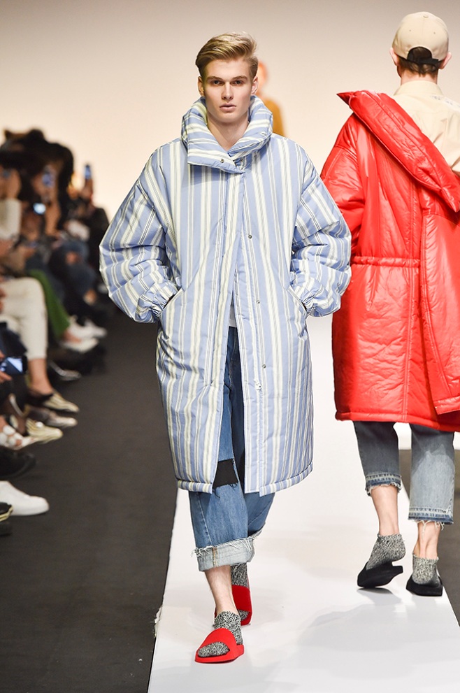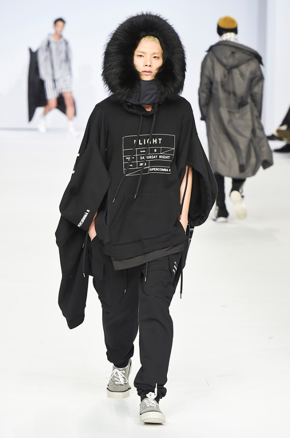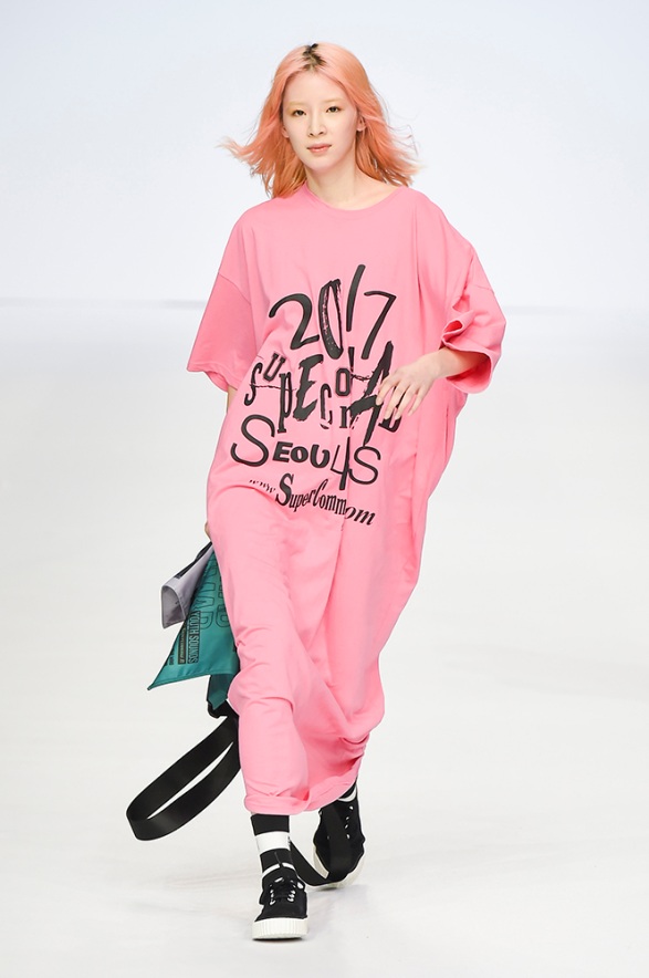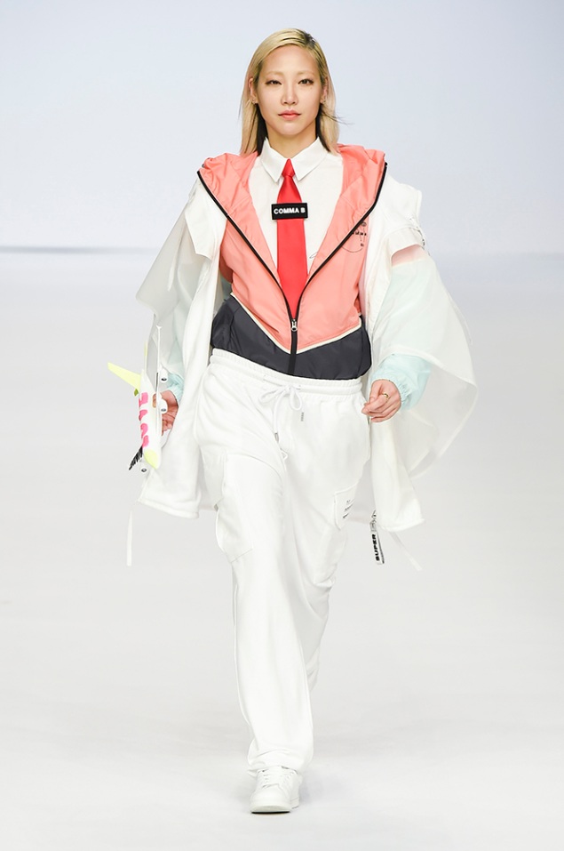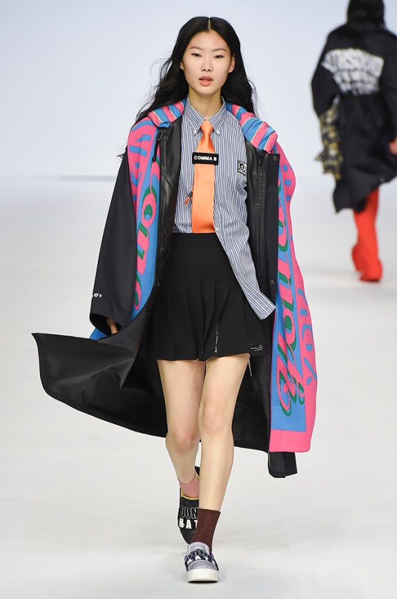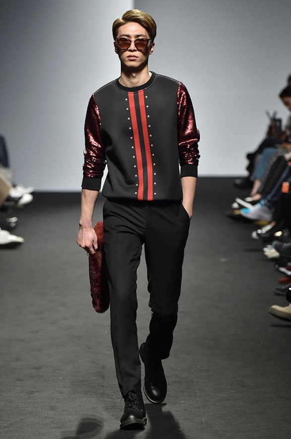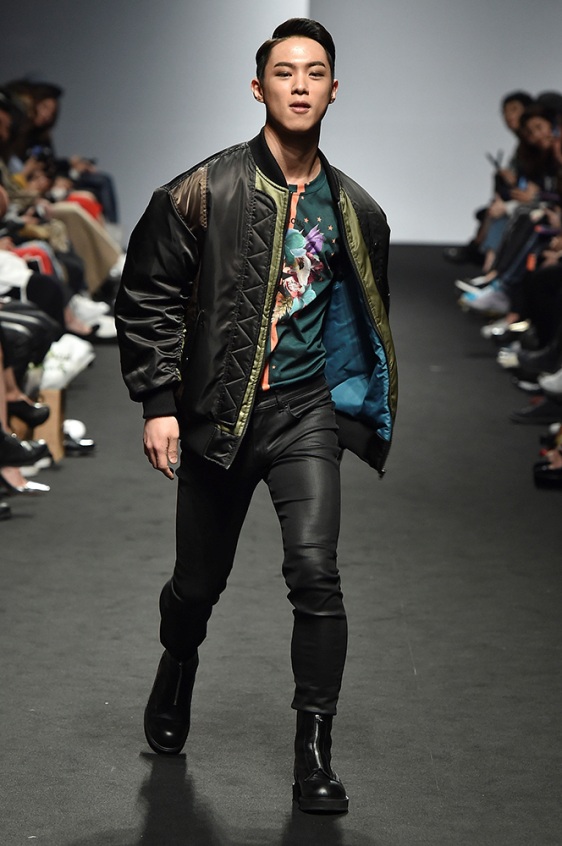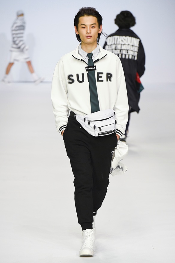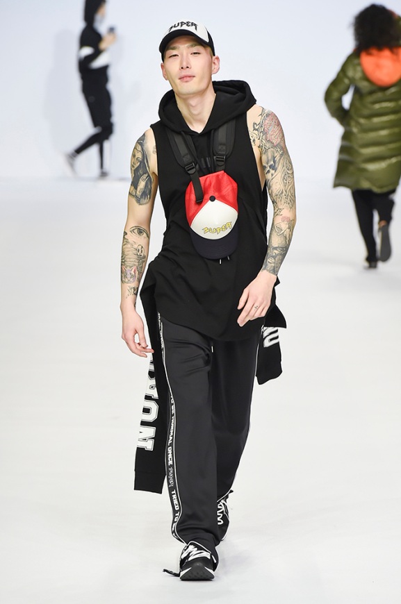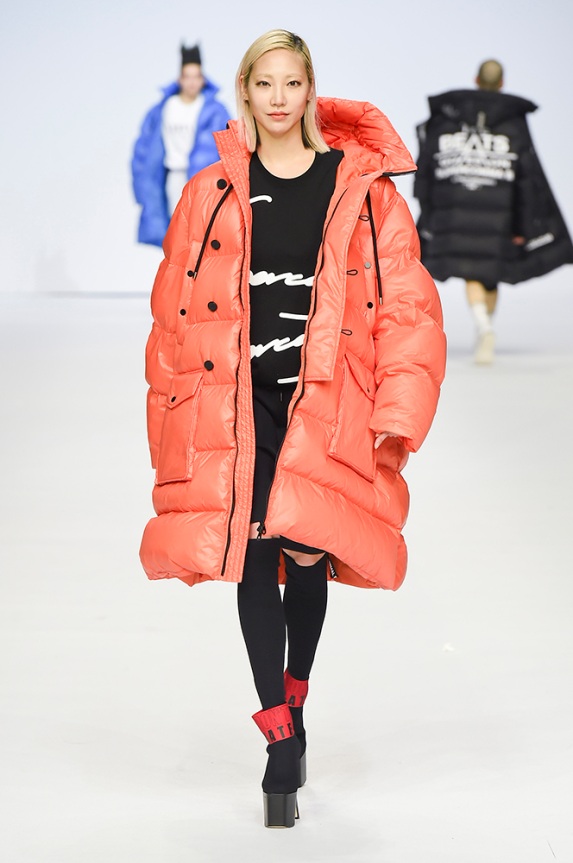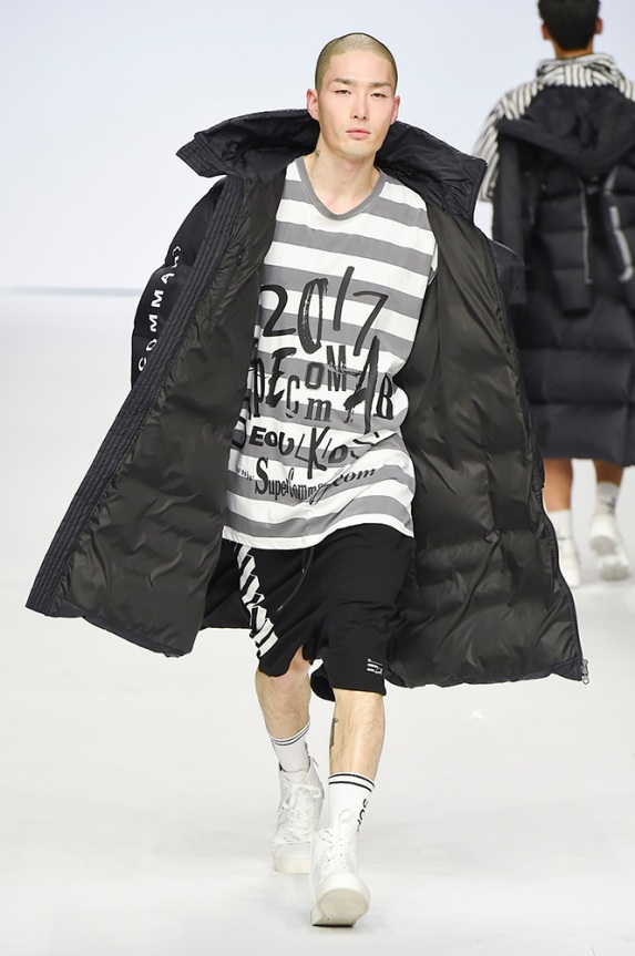 Supercomma B, brought an exciting performance in their 2017 F/W winter presentation. The show included big names in the Kpop industry adding “fun” and a youthful tough to the fashion walkways. There were some popular trends that appeared on the show like the oversized and fun-colored puffer jackets, puffer pants and long arm sleeves. There was no lack of color as the audience saw vests, track pants and even ties in bright green, blues and reds which gave the collection a sporty essence and a retro and pop feel. Models added excitement to the runways as shows were also being streamed live on Facebook—which also allowed those who were unable to make it to SFW feel included.